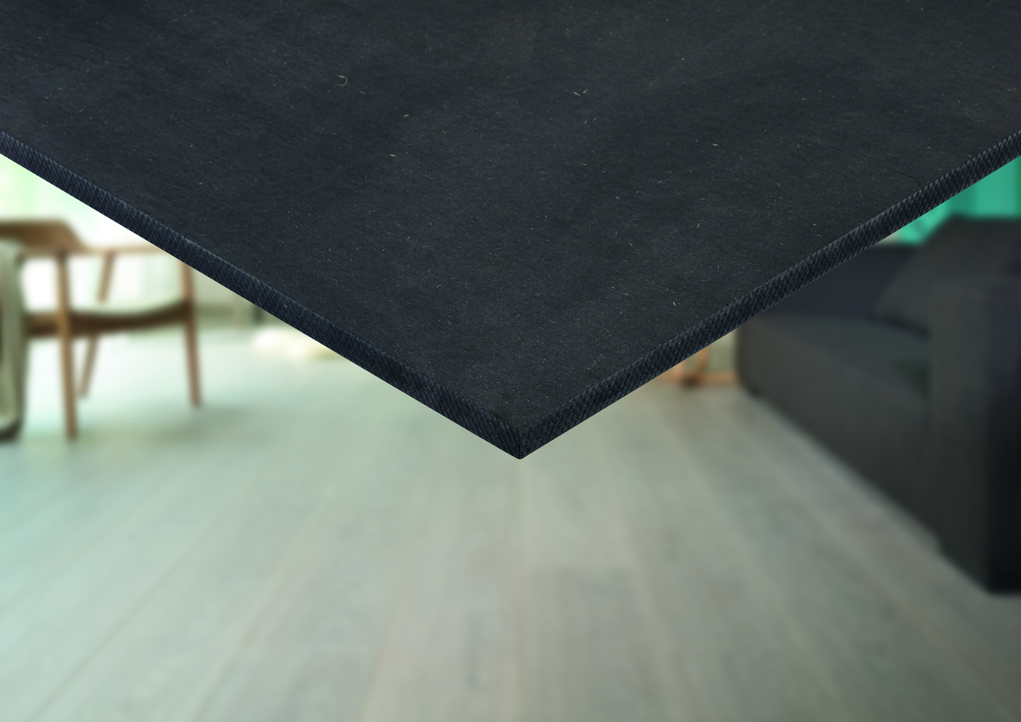 High-density MDF board, coloured black in the mass with a hard, fine and smoothly sanded surface. The board is subject to minimal expansion and swelling in conditions of high humidity.